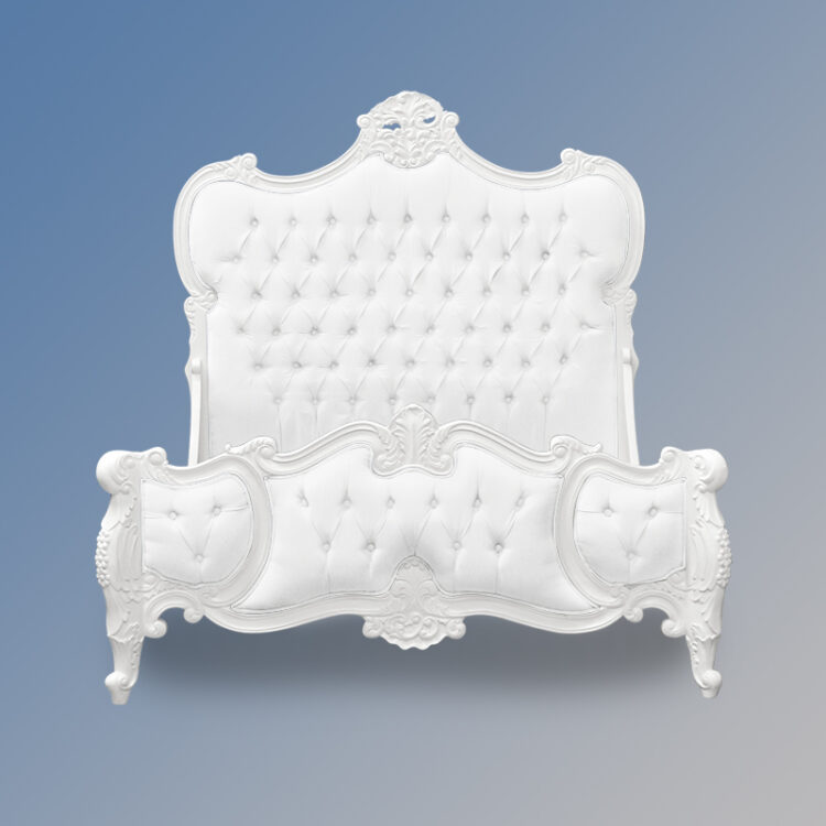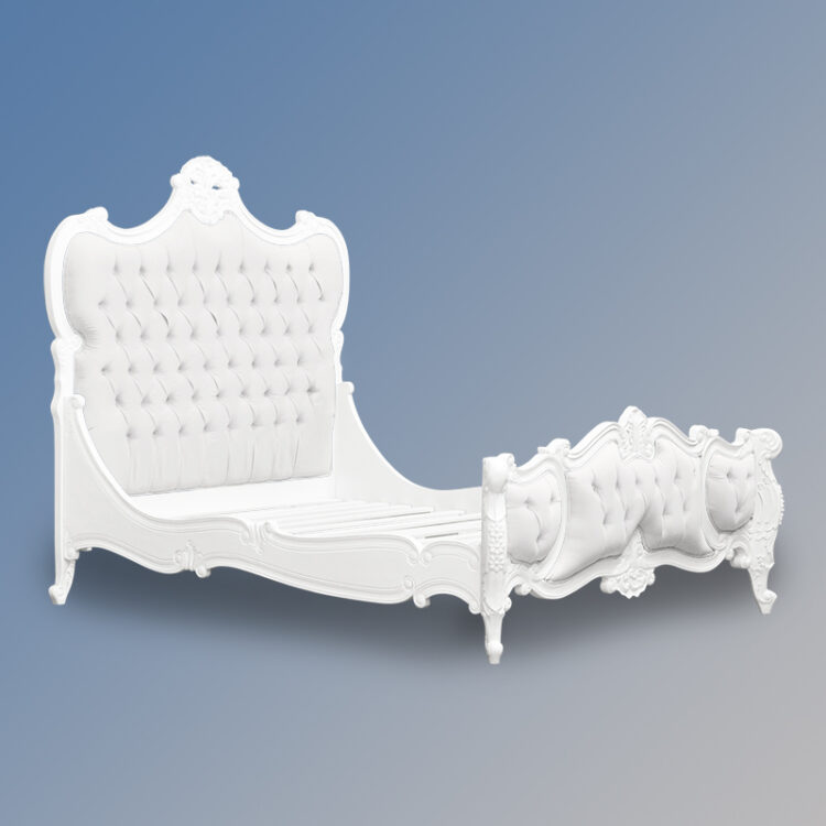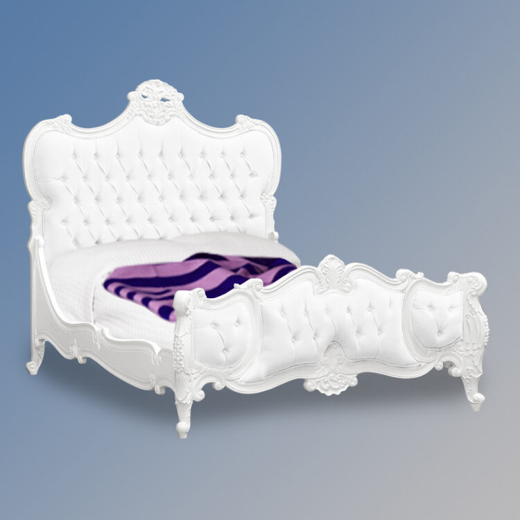 Louis XV – Genevieve Sleigh Bed in French White and White Faux Leather Upholstery