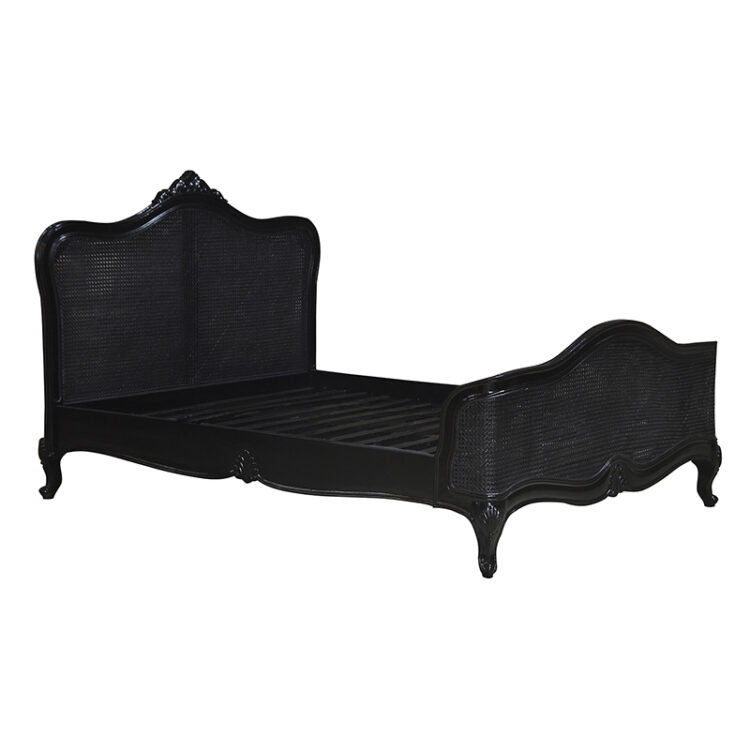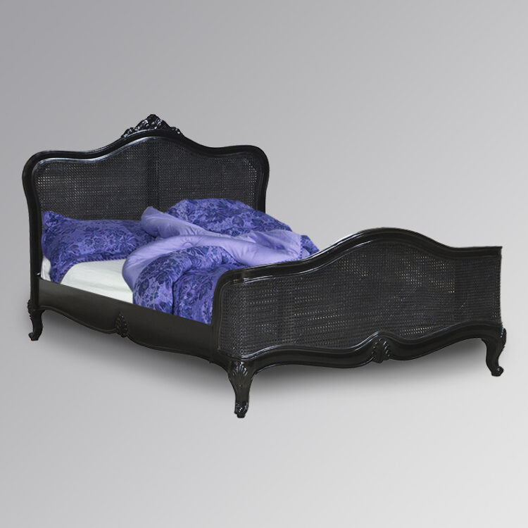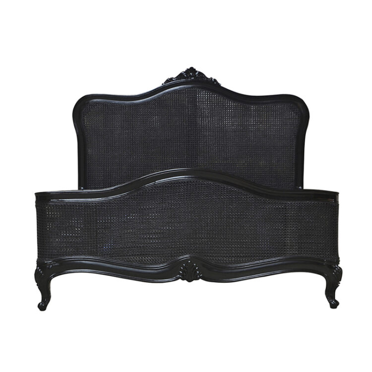 • Finished to a beautiful satin patina in French Noir with a rattan head and footboard.