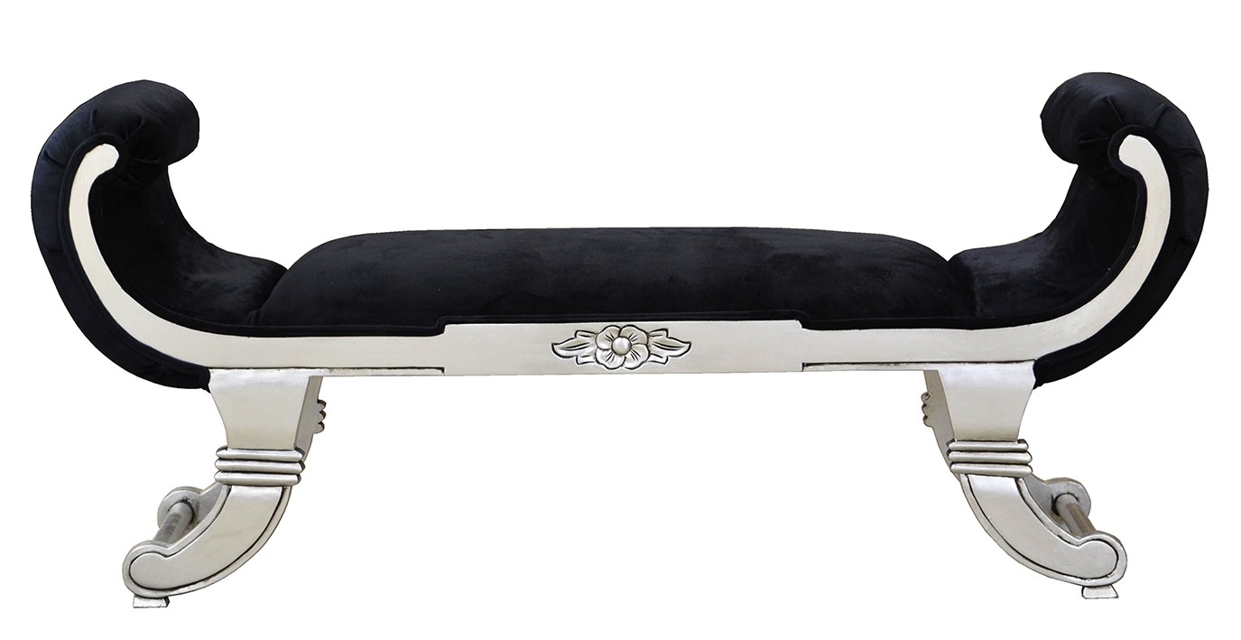 This beautiful Versailles end of bed Vendome stool is made from solid mahogany wood, and is hand polished and finished to a beautiful satin patina with silver leaf delicately applied. The design is from the Louis Philippe era of French furniture circa 1845. The fabric is black velour with edge stitching , it’s a perfect fit and looks stunning as an end of bed stool.